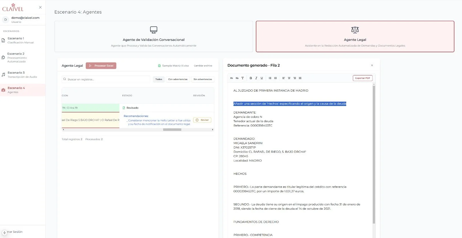 Los agentes de Claivel son impulsados por inteligencia artificial siendo capaces de gestionar grupos de tareas asociadas a procesos empresariales de forma autónoma. Estos agentes interpretan el contexto, aprenden continuamente y adaptan su enfoque según las condiciones cambiantes. No siguen reglas pueden abordar tareas impredecibles y tomar decisiones informadas, con flexibilidad y criterio experto.